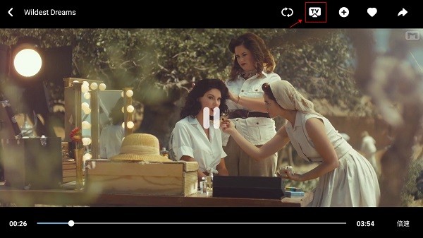 2、点击屏幕任意位置,便会弹出菜单选项,在右上方的位置找到“TV”图标,音悦台会自动搜索投屏设备,之后等待连接成功将MV投屏到电视或其他智能硬件设备。