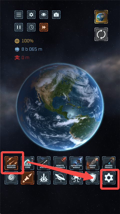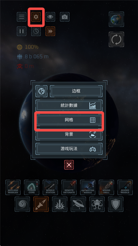 1、打开星球毁灭模拟器游戏,设置一个地球,点击左上角设置图标,打开网格。