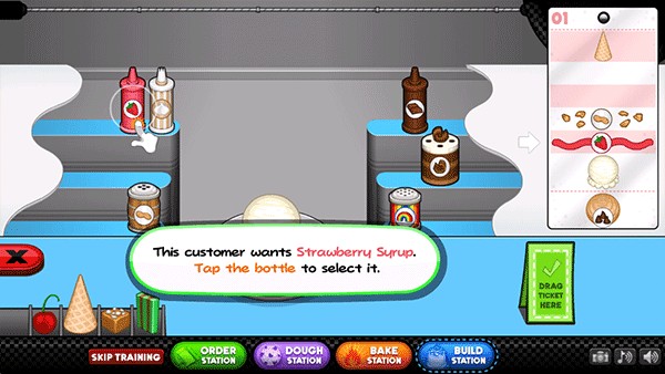 5、你需要用手舀冰淇淋!慢慢地拖动铲,并试着与篮筐周围的点的速度相匹配。6、这位顾客想要草莓糖浆,点击瓶子进行选择。