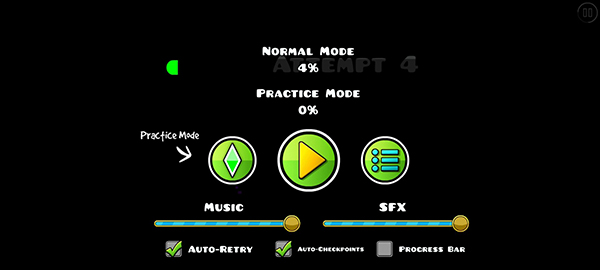 进入游戏前,你必须先要确定自己是否准备完毕了,因为一进入游戏中,你就得做好让方块跳跃障碍物的准备,有人会说缓不过神来的话可以先暂停一下子,但当你按了暂停键后你就会发现你完全看不见方块和障碍、的位置。因此小编认为,在不必要的情况下,尽量不要暂停键,不然继续游戏的那一瞬间,可能就是你重新游戏的时候了。
