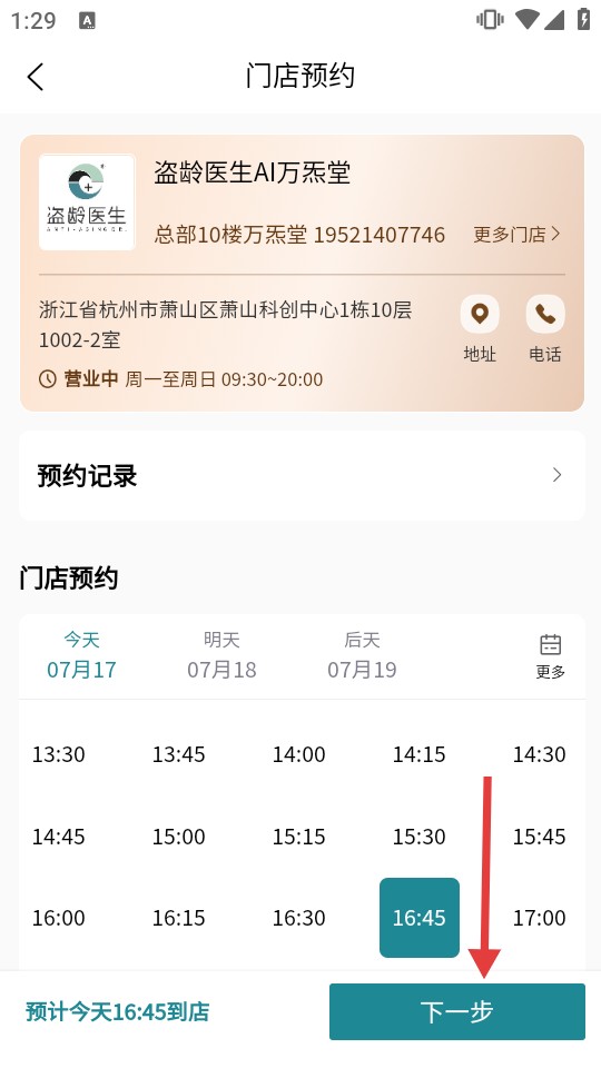 3、在门店预约页面,选预约日期、时间,点【下一步】,进入预约信息确认页面。