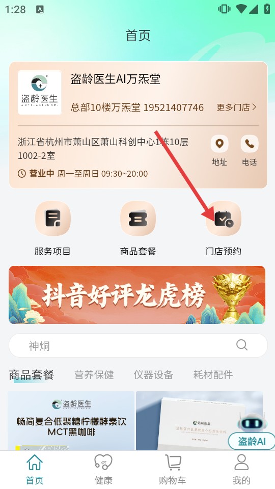 1、在APP首页,点【门店预约】,进入门店选择页面。
