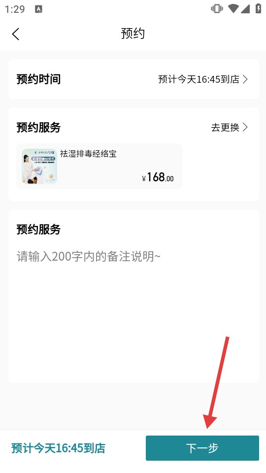 4、在预约信息确认页面,确认预约时间、服务,填备注(可选),点【下一步】完成门店预约。