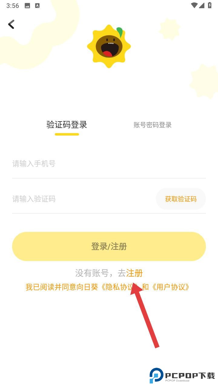 2、接下来是登录界面。登录方式有两种:用验证码或者账号密码。要是第一次用没有账号,记得点画面下方的 “去注册” 字样,跳转到注册页面。