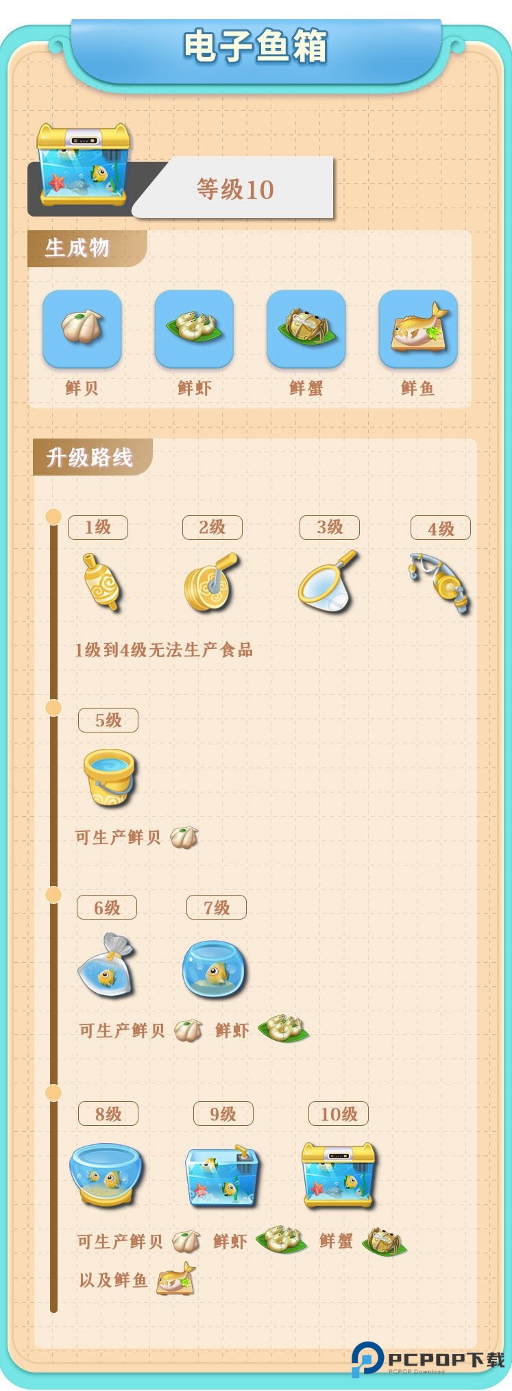 渔线→放线器→渔网→鱼竿→渔桶(鲜贝)→鱼袋(鲜贝 + 鲜虾)→小鱼缸→鱼缸(鲜贝 / 鲜虾 / 鲜蟹)→鱼箱→电子鱼箱(鲜贝 / 虾 / 蟹 / 鱼・满级 10 级)