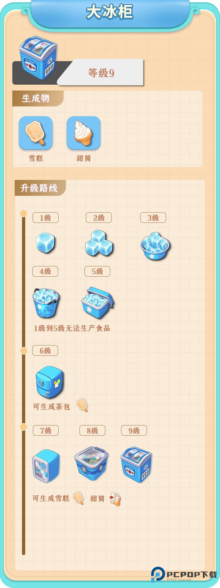 冰块(1 级)→冰块(2 级)→冰块盆→冰块桶→冰块箱→小冰箱(雪糕)→冰箱(雪糕 + 甜筒)→冰柜→大冰柜(满级 9 级)