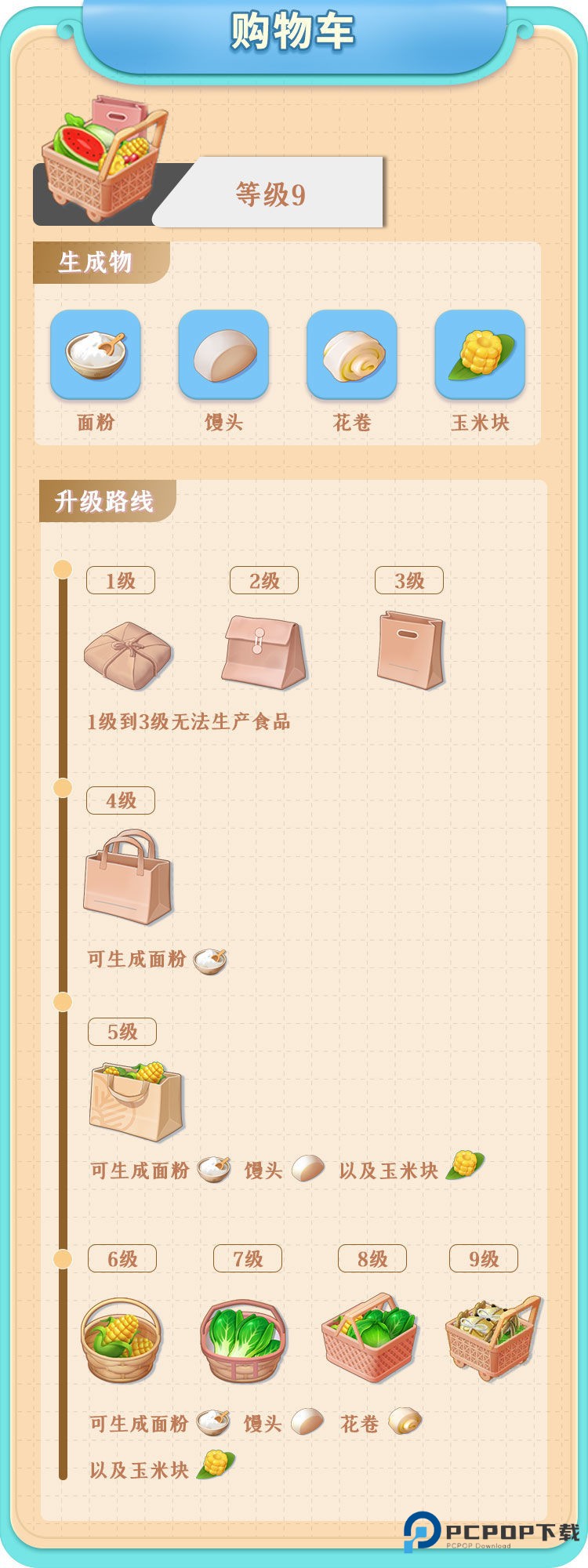 纸包→大纸包→纸袋→手提袋(产面粉)→购物袋(产面粉 / 玉米)→购物篮(产面粉 / 馒头 / 花卷 / 玉米)→竹编购物篮→精致购物篮→购物车(满级 10 级)