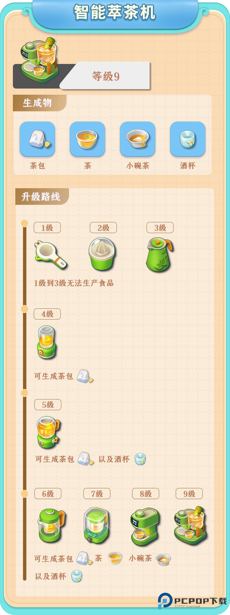 手压榨汁机→手摇榨汁机→煮茶器→煮茶机(茶包)→萃茶机(茶包 + 酒杯)→高级萃茶机(茶包 / 茶 / 小碗茶 / 酒杯)→智能萃茶机(8 级)→满级 9 级