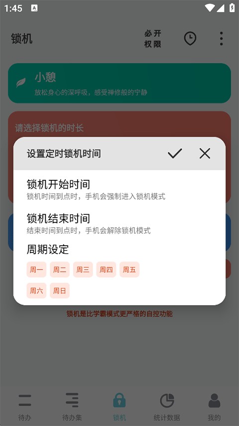 5、在设置定时锁机时间中调整锁机开始时间、结束时间以及周期设定,完成后点击上方的✓确定。