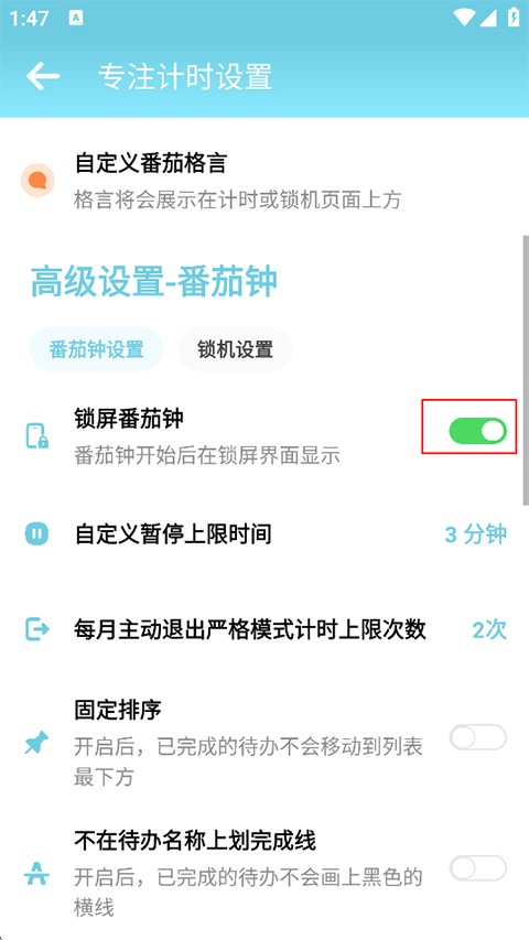 2、在专注计时设置中下滑找到锁屏番茄钟,打开右侧的开关即可。
