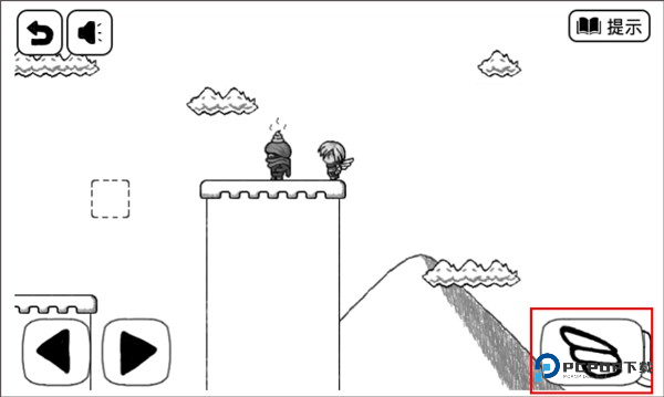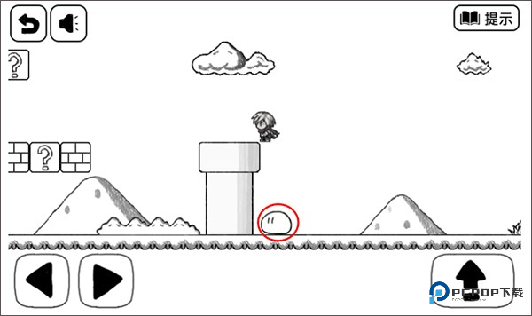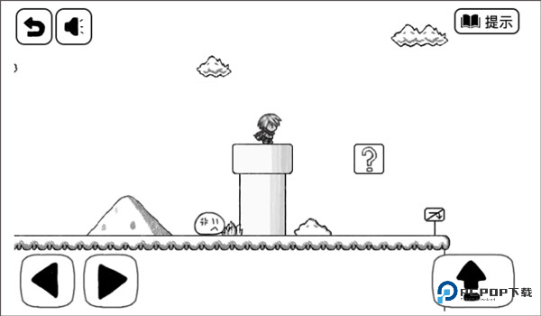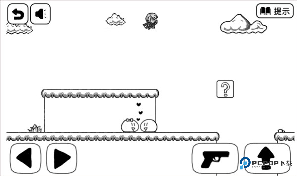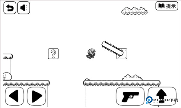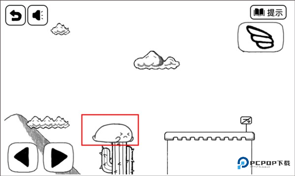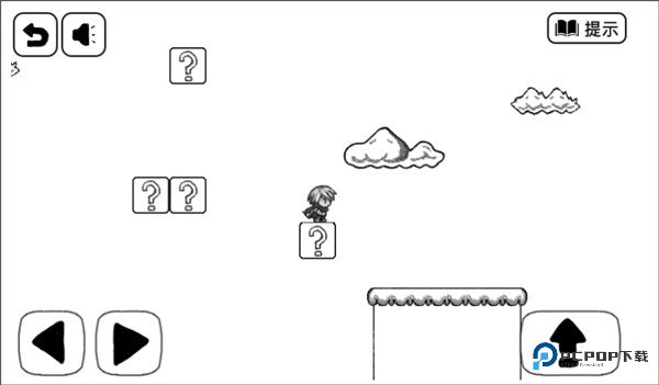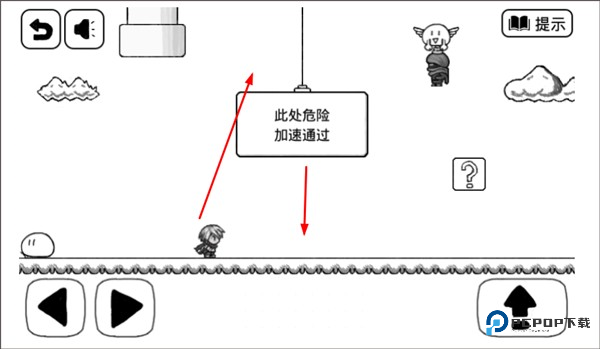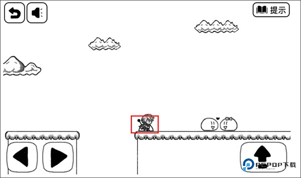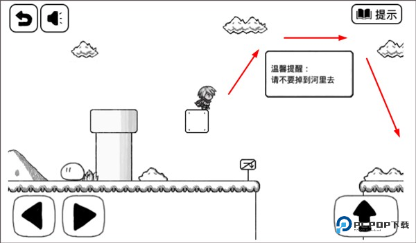 3、方块快要往下掉的时候,瞅准机会跳到左边的陆地上。记住啦,跳起来别太高,顶到天上的云可是会被戳死的。