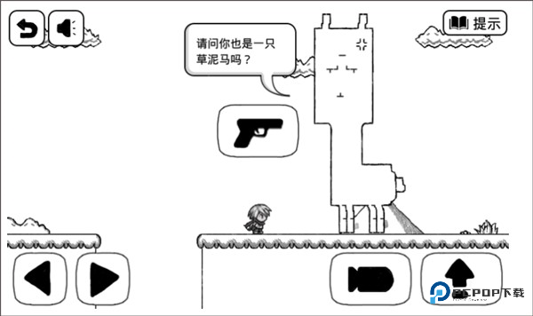 4、到达最后的平台,会跳出来一只大草泥马(羊驼)?需要把手枪图标拖到游戏界面的空白处,点击这个新出来的图标发射炮弹,一炮就能轰飞草泥马,成功过关!