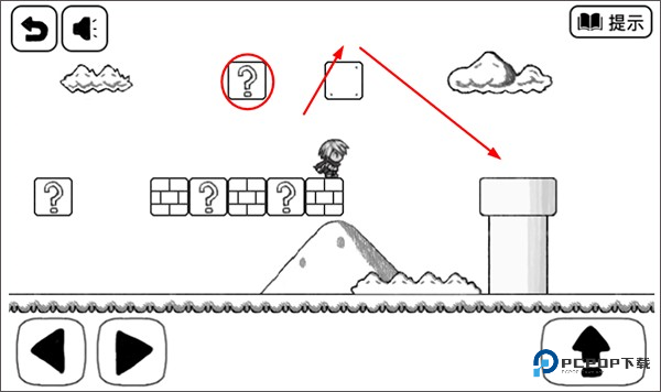 4、在这儿顶出提示方块,踩到方块上再起跳,就能跃过那个超级宽的大坑,自己跳可实在过不去。