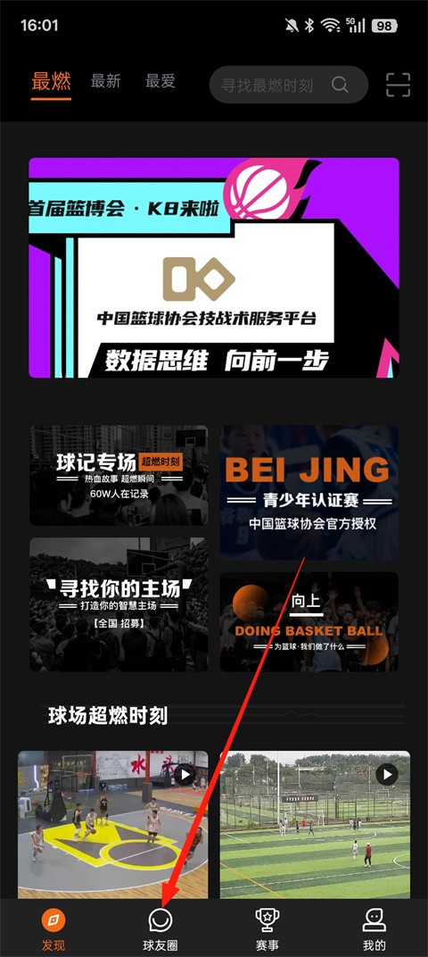 1、打开球记APP,登录之后,点击【球友圈】