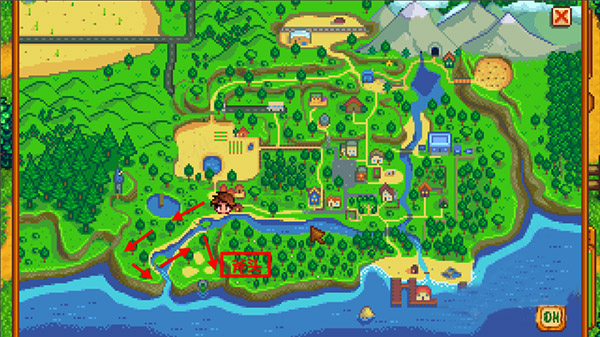 9、一旦有鱼竿有鱼饵之后,去卖鸡卖羊卖牛的地方,在那张地图下方有一条河,有很高的几率可以钓到一种鱼叫PIKE,这个鱼的难度适中,而且价格高(金色星星一只可以卖100多),如果刚好碰到下雨天不用浇水,从早钓到晚上,一天下来收入可以有2000~3000,如果运气好一天甚至过4000都没有问题。