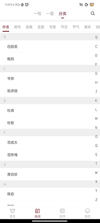 2、诗词界面可以从各种分类来了解,软件也会每天推一句、一首