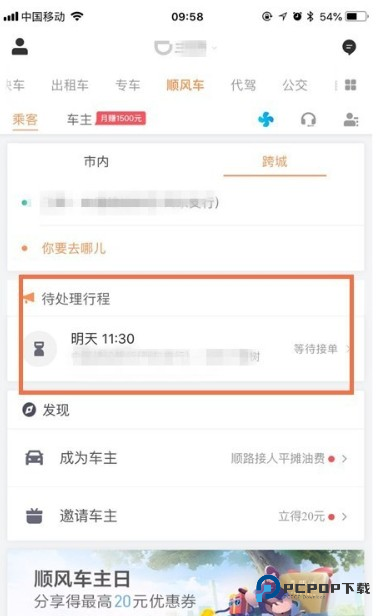 2、App 打开后,注意看当前主界面,找到 “待处理行程” 或者订单确认的提示卡片,点进去。