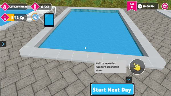 水上乐园模拟器(WaterparkSimulator)手机版是一款由Steam移植而来的模拟经营类游戏,它以水上乐园为主题,玩家将在游戏中扮演一名经理,你需从购买游泳池、椅子、滑滑梯等多种设施开始,通过合理放置在场景中亲手打造出一家火爆的水上游乐场。水上乐园模拟器手机版内玩家还要根据顾客的需求选择时间、模式以及进行结账,过程中可能面临突发事件,如溺水情况需获取救生圈给顾客,否则你会收到罚款,结束本次经营天数。