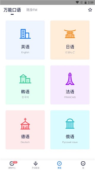 1. 支持多种语言学习:软件包括英语、法语、德语、日语、韩语等不同的语言,以此满足不同用户的需求。