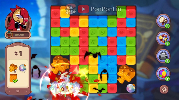 与搭配上场的饼干角色就会与日俱增,根据关卡的不同来搭配1只特殊的饼干上场吧! (上图为吸血鬼饼干能消除固定5格的障碍物)