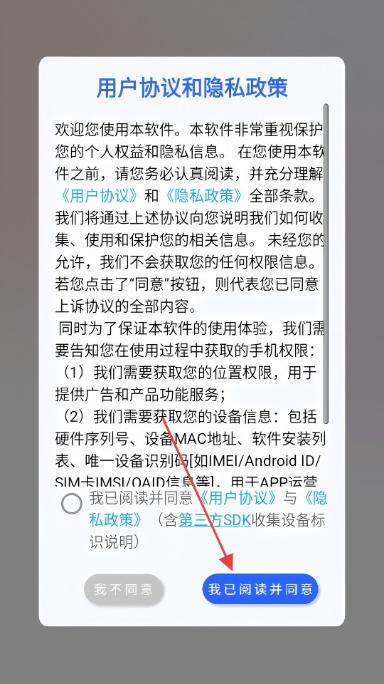 1、在“用户协议和隐私政策”弹窗中,点击【我已阅读并同意】,进入软件主界面。