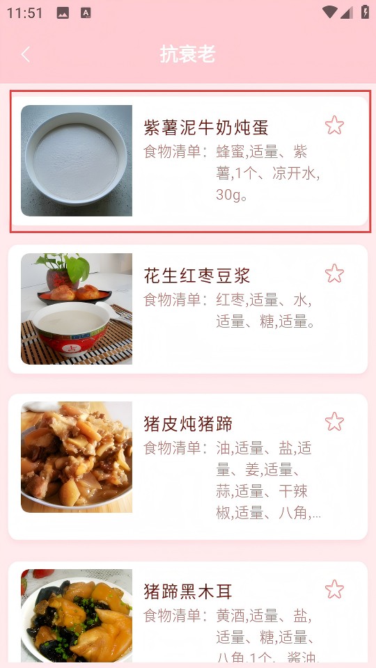 3、在抗衰老饮食推荐页面,选择【紫薯泥牛奶炖蛋】,进入该菜品的详情页面。