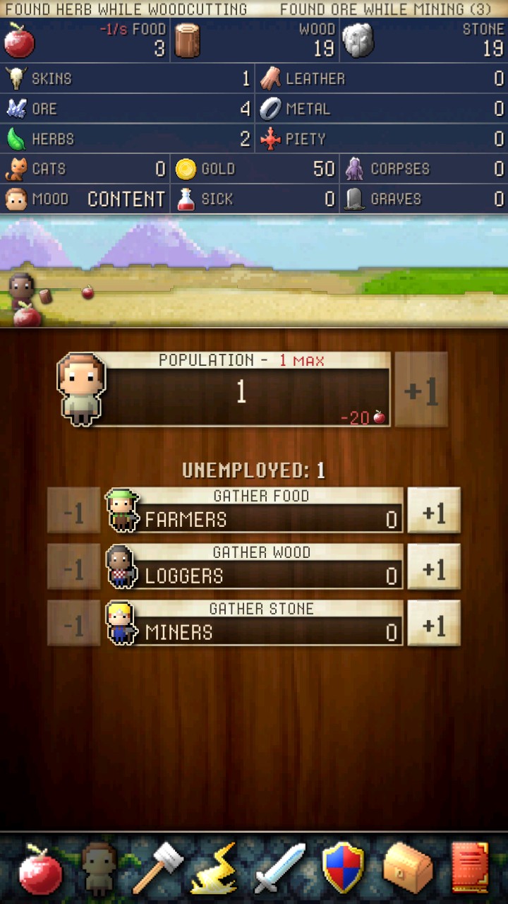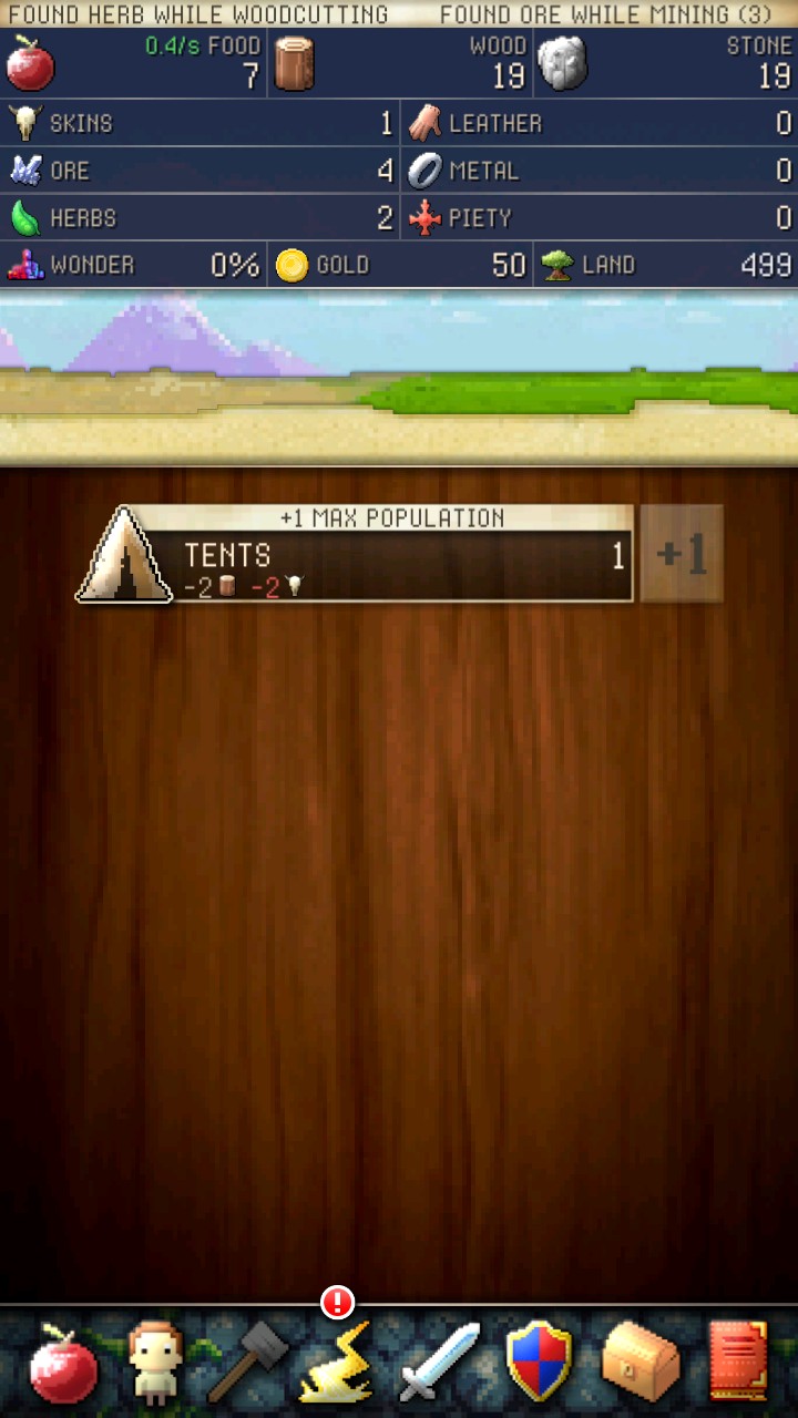 这是一款非常简单粗暴的策略游戏,我们在不同属性的列表下发展我们的经济,壮大人口以及扩大疆域。在资源收集方面,我们有三种基础物资,而获得他们的方式也非常的原始,只要不断的点击就行了。三种物资的图形几乎就占了一半的画面,三角摆放也寓意着它们将会是这个帝国建立的基础。上方的列表展示的是当前各项资源的出入情况以及实时动态。