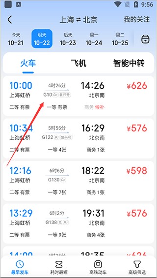 2、然后就能查看到当日所有的列车和价格,根据自身的需求选择时间,对比价格。