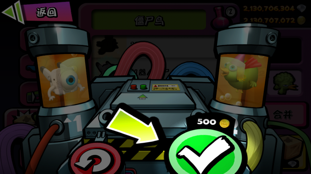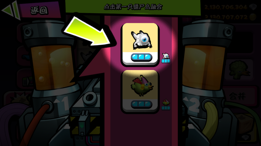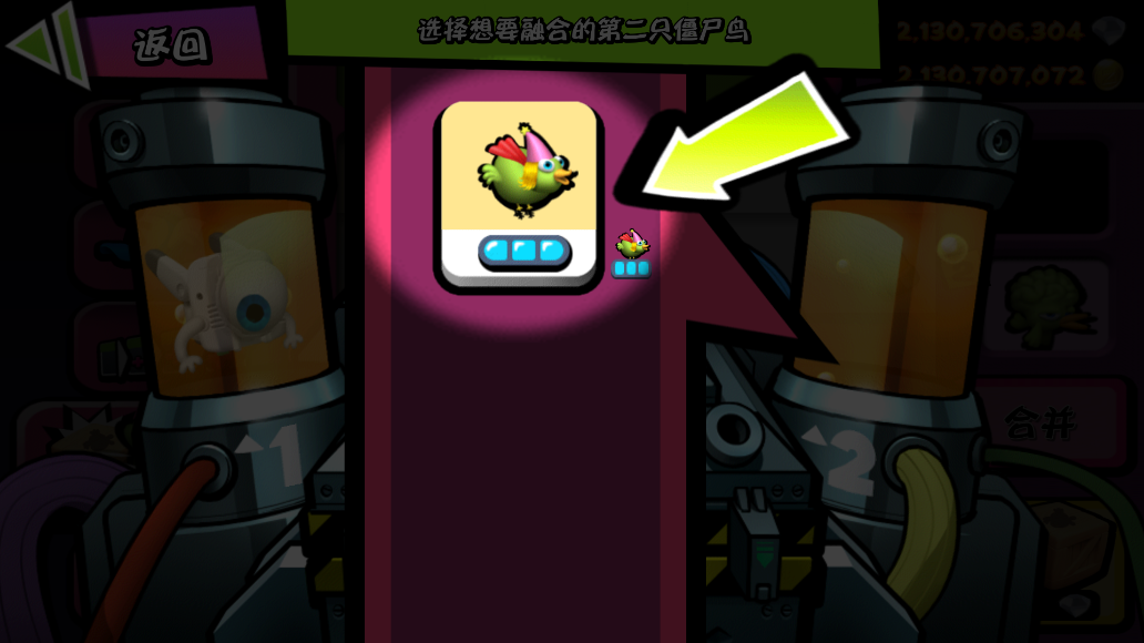 4、这时候点击右边的【合并】,再点击第一只僵尸鸟。