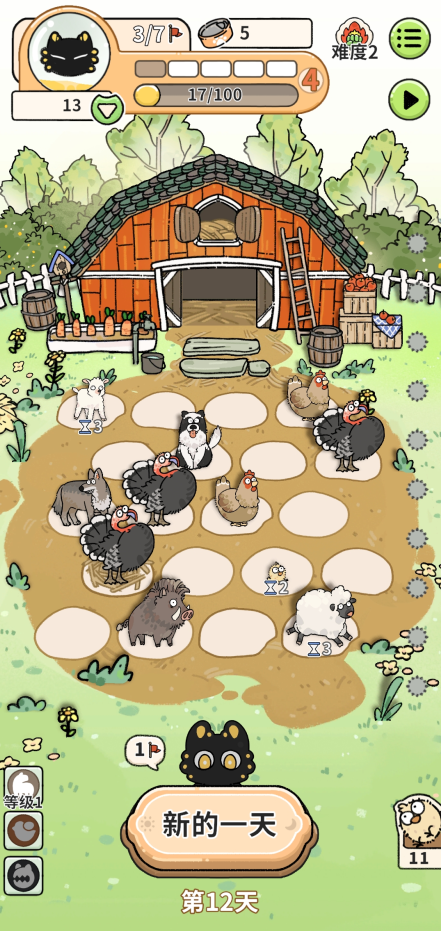 猫神牧场手机版是一款休闲策略肉鸽卡牌构筑游戏,由steam同名游戏移植而来。玩家将成为牧场管理员,通过选择和饲养不同的动物赚取收益,用来供奉猫猫神,每过一天都能在随机三个动物里选择一个。每只动物都拥有独特能力,动物之间还存在生态关系,会触发各种有趣的连锁反应,比如公鸡母鸡相邻有几率会生蛋、狐狸会捕食附近的鸡、牧羊犬会保护周围的羊等等。