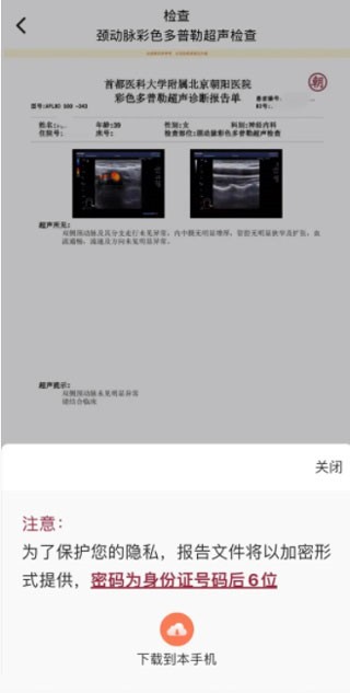 3、点击您的化验检查即可出现报告结果,如需下载至手机,只需输入您的身份证号码后6位,就可以下载保存。