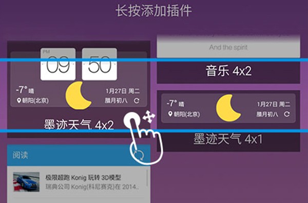 3、选择某种尺寸的墨迹天气小插件,长按拖动到桌面上即可。