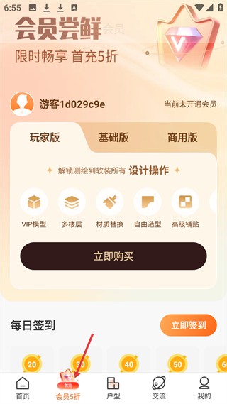 2、会员5折页,会员首充5折,分玩家版、基础版、商用版,玩家版解锁测绘到软装所有设计操作,可每日签到领奖励。