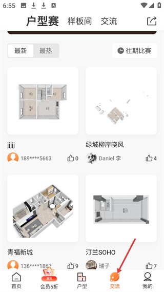 4、交流页有户型赛、样板间板块,展示用户分享的户型设计如绿城柳岸晓风、青福新城,可互动交流户型设计心得。