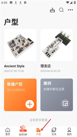 3、户型页展示Ancient Style、理发店等户型案例,可新建户型或查看案例,方便用户管理和创建户型设计。