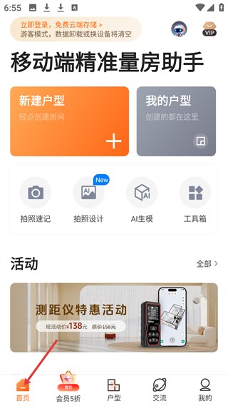 1、首页是移动端精准量房助手,可新建户型、查看我的户型,还有拍照速记、AI生模等功能,推出测距仪特惠活动。