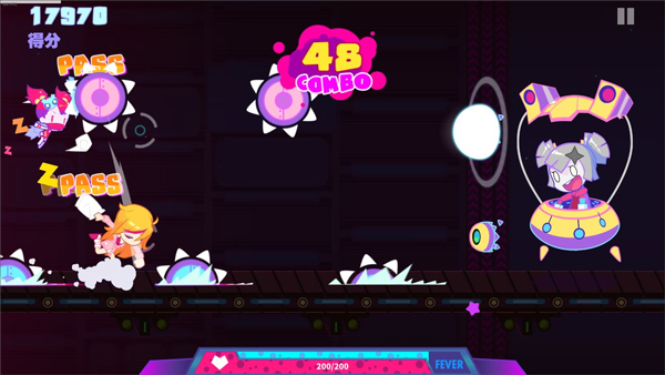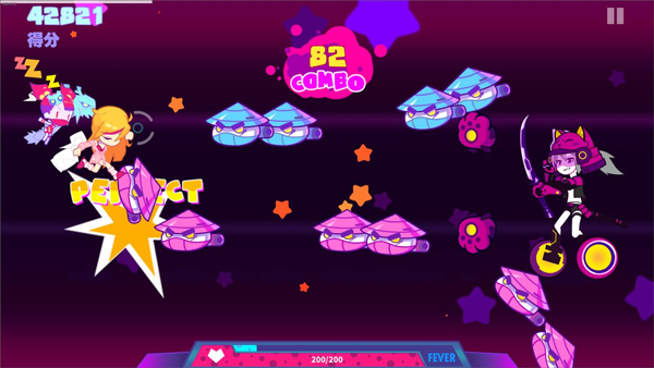玩家控制角色在轨道自动奔跑,通过点击 / 长按 / 滑动操作击打敌人、躲避障碍,严格匹配音乐节拍。