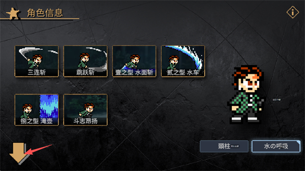 5、可以看到升级版的水之呼吸的招式更多,随后可以点击屏幕左下角的“箭头”标识返回上一界面即可,无需确定选择角色。