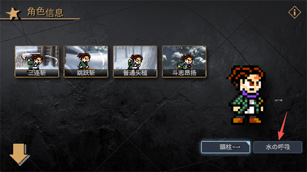 4、就会发现游戏角色拥有两种形态,一个是基础形态,另一个往往是升级形态,碳治郎的升级形态为水之呼吸,点击屏幕右下角的“水之呼吸”就可以切换。