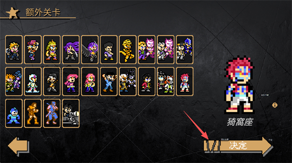 采用经典16位像素美学风格,借助动态光影与粒子特效,使画面呈现出复古与现代交融的视觉冲击力。角色建模精准复刻了历代JOJO的标志性画风,每个角色都有专属战斗姿态与替身特效。