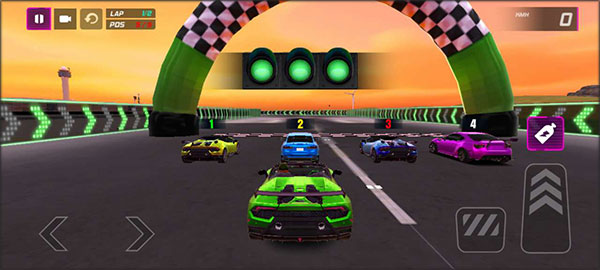 3、开始游戏后,左边按键控制车辆的方向,右边按键是加速和刹车,加速上方是氮气,可以快速提升车的速度,左上角摄像头按键可以更换视角。