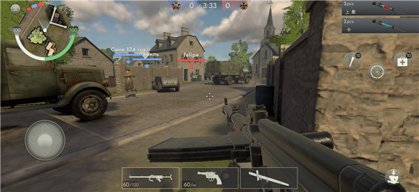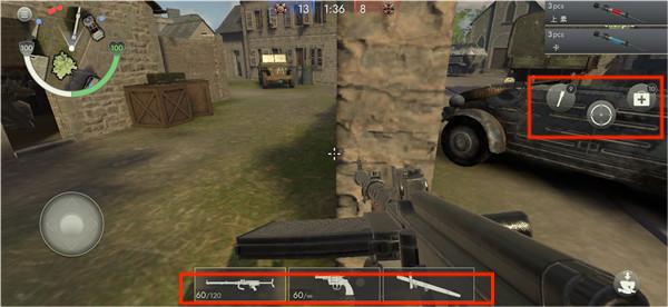 4、屏幕下方代表可以切换的武器,右边有手榴弹以及治疗包,玩家可以合理的运用这些武器
