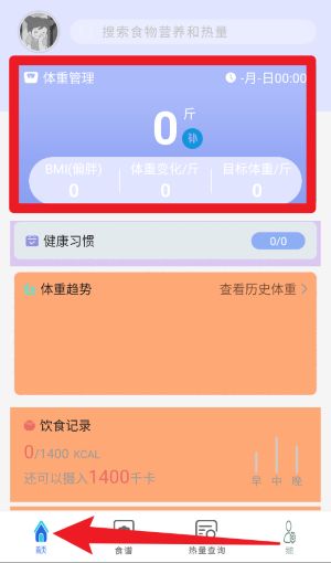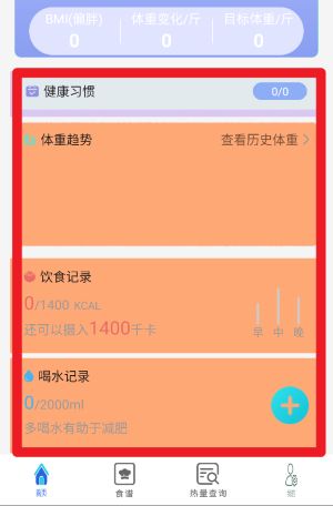 2、继续下滑页面可记录饮食、饮水及健康习惯,支持三餐分时段记录,方便日常健康管理和体重趋势追踪。