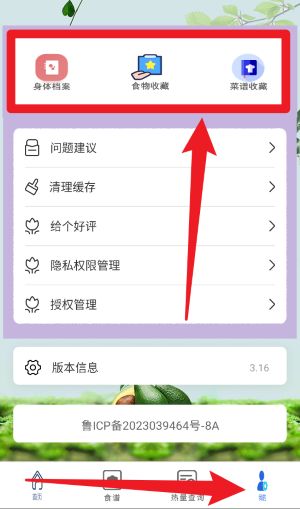 5、点击“我的”页面可管理个人档案、查看收藏的食物与食谱,同时支持意见反馈、权限设置等功能操作。