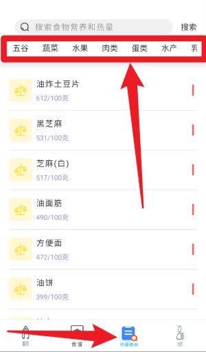 4、在“热量查询”页面中,可以根据五谷、蔬菜、蛋类等分类快速查询各种食材的热量与营养信息。
