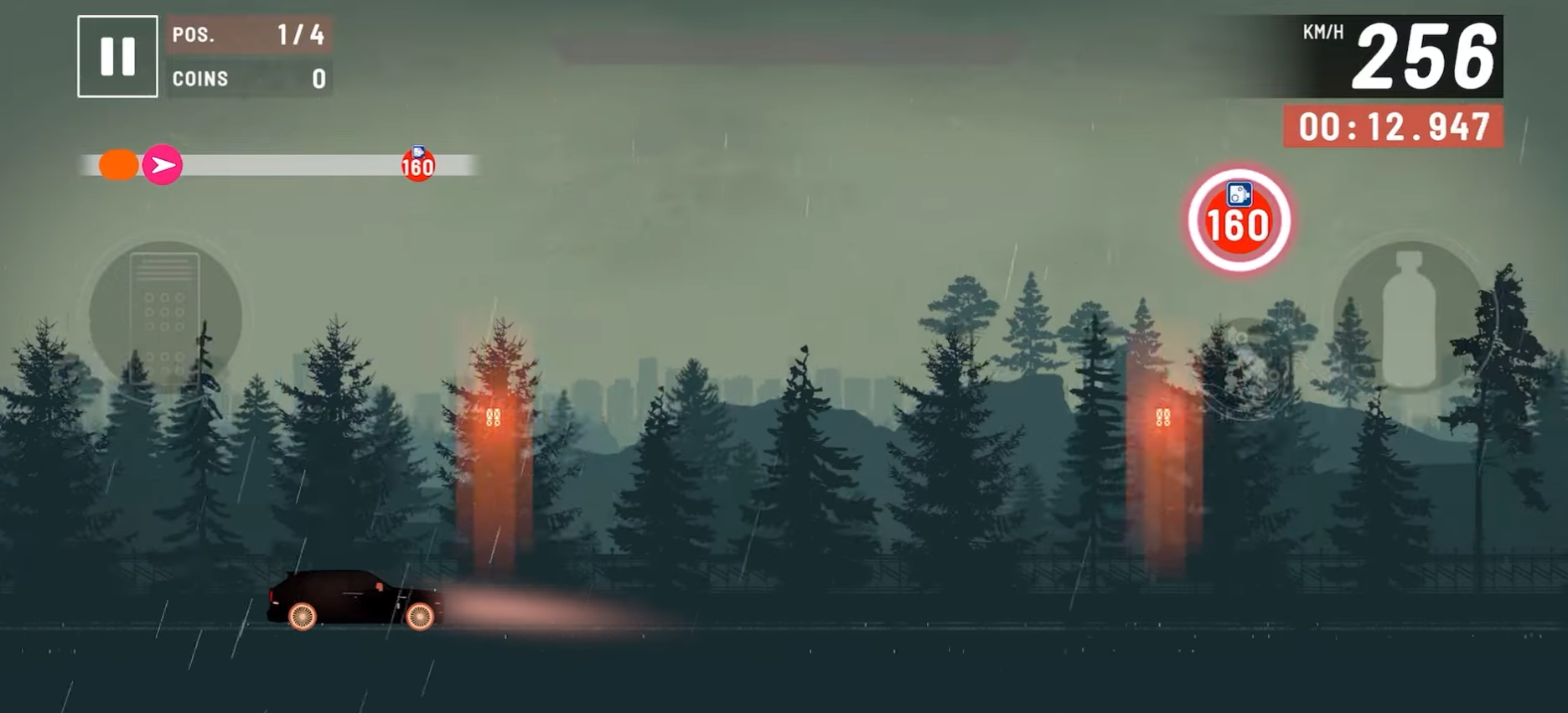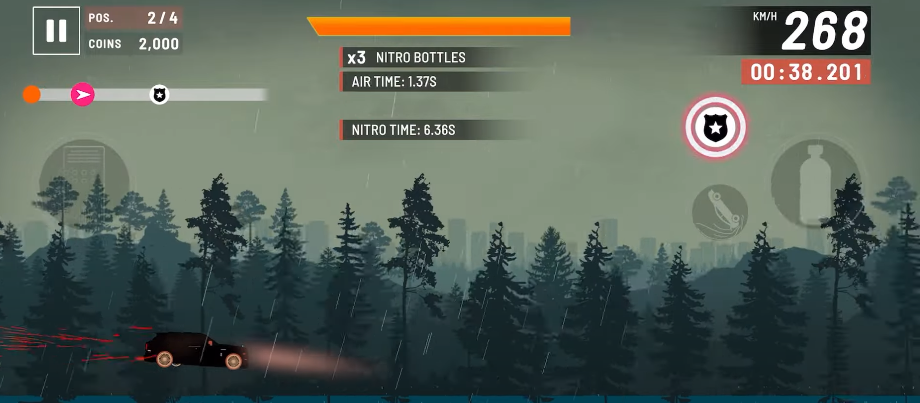 2、游戏操作很简单,左侧是控制前进和刹车,右侧是加速道具,右上角可以看自己行驶了多少千米