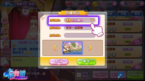 2. 在魅舞大厅点击“创建房间”,在【房间模式】下拉菜单中选中“约会模式”并确认创建,即可开启约会模式游戏;