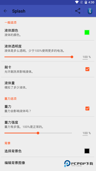 5、进入设置界面后,可看到多个可调节选项:液体相关选项(液体颜色、透明度、液体量等)、重力选项,以及背景选项。