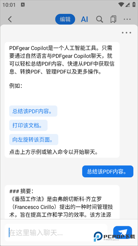 7、PDFgear内置智能AI助手,找到AI助手入口并点击,输入相关命令(如“总结此PDF内容”),即可与AI互动,快速获取所需帮助。