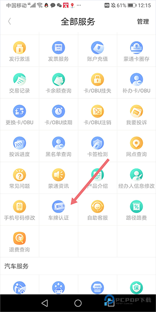 2、在全部服务页面中,点击【车牌认证】功能;